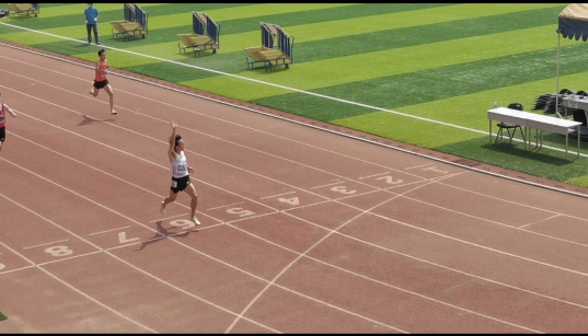 男子高水平组400米决赛冲刺画面,我校运动员梁耀文一马当先冲过终点
