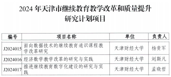 2024年天津市继续教育教学改革和质量提升研究计划项目是天津市教委设立的继续教育教改项目,旨在推进高校学历继续教育改革发展和非学历继续教育规范办学等继续教育办学形式高质量发展,全面提升人才培养质量和服务全民终身学习能力。未来,我校将加强对继续教育教学改革项目的组织和管理,积极营造良好的学术研究氛围,促进我校继续教育教学和科研提质增效,将研究成果不断应用到实际工作中,并为我市继续教育事业取得更大发展贡献天财智慧。