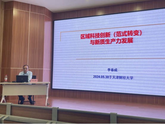 为深入学习贯彻落实习近平总书记视察天津重要讲话精神、关于科技创新与科学普及工作的重要论述,围绕服务高质量发展“十项行动”和推动科技创新、产业焕新,服务发展新质生产力,以“天津市第38届科技周活动”为契机,5月30日由我校会计学院联合无形资产评价协同创新中心、科技创新与成果转化办公室共同举办专家讲座。此次活动特邀天津市自然辩证法研究会理事长李春成研究员,为师生做主题为“区域科技创新与新质生产力”的报告。讲座由会计学院副院长胡国强教授主持,来自各学院100余名师生踊跃参会,共襄学术盛宴。
