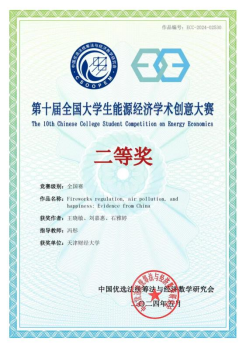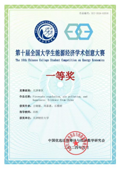 学院由冯彤老师指导的学生王晓敏、刘嘉惠、石雅婷,参赛作品《Fireworks regulation, air pollution, and happiness: Evidence from China》荣获研究生组国赛二等奖、天津市赛区一等奖。此次大赛鼓励学生关注和思考能源领域的实际问题,提出创新性的解决方案,这对于推动我国能源结构的优化升级,实现绿色低碳发展具有积极的推动作用。备赛和参赛过程进一步激发学生在学术研究、实践能力、团队合作等方面的学习和创新意识,切实做到“以赛促学、以赛促教”,促进学院研究生教学与人才培养质量的双提升。
