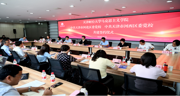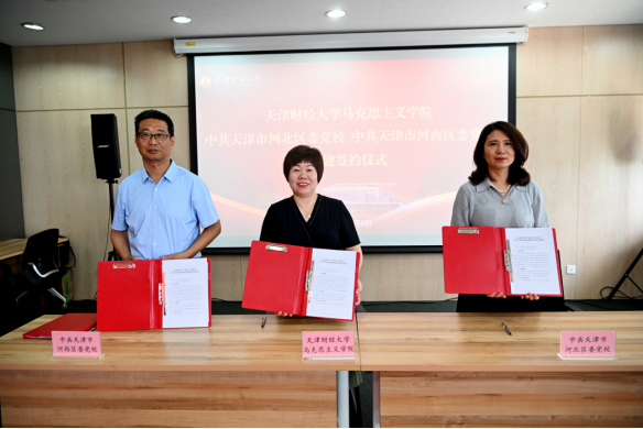 为贯彻落实习近平总书记关于推进思政课建设的重要指示精神,推动校地合作、资源互通,进一步开创新时代思政课建设新局面、提升教育教学及培训工作质量,6月6日上午,马克思主义学院与河北区、河西区委党校举行了共建签约仪式及研讨座谈会。校党委副书记侯洁出席签约仪式并致辞,河北区委组织部副部长高亮、徐娜,党校副校长张莹、刘鑫,河西区委组织部副部长赵剑锋,党校副校长张立军、韩淑霞,马克思主义学院领导班子成员以及一院两校的干部教师代表参加了签约仪式。校党委常委、马克思主义学院党委书记朱国华主持签约仪式。