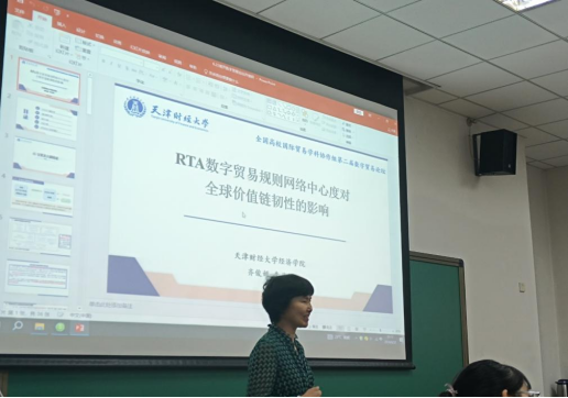 齐俊妍教授在专家论坛做了题为《RTA数字贸易规则网络中心度对全球价值链韧性的影响》的主题演讲,反响热烈。耿伟教授、王岚教授作为点评专家分别对分论坛的论文进行了点评。此外李宏教授与学生田明羽的合作论文《产业链创新融合与全球价值链参与度》、耿伟教授与学生贾兴兴、朱佳的合作论文《机器人贸易网络地位与价值链韧性》、王岚教授与学生陈影的合作论文《本土市场规模、数字化投入与全球价值链风险》以及耿伟教授与学生刘晓茜合作论文、康茂楠博士与学生马然合作论文、杨晓亮博士与学生程晓楠、冯凤杰合作论文和梁贺博士学生郭鑫源合作论文共7篇,分别在4个平行分论坛上进行了宣讲交流,并得到了资深专家的宝贵建议。