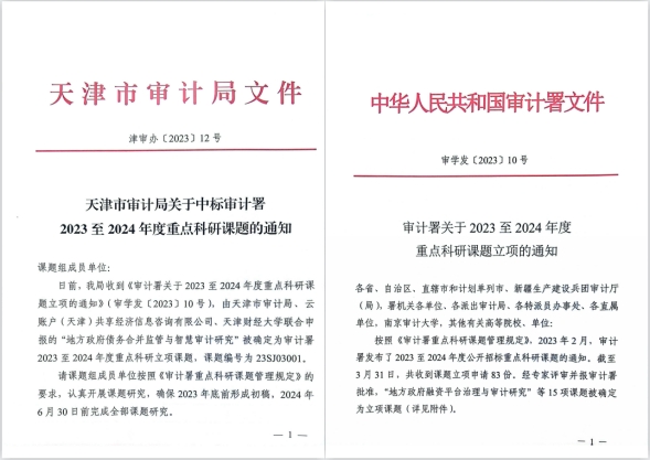 2023年3月,学院与天津市审计局、云账户(天津)共享经济信息咨询有限公司共同开展“地方政府债务合并监管与智慧审计研究”主题的合作研究,三方充分发挥各自的研究实力和优势,共同申报并获批审计署2023至2024年度重点科研课题(全国申请83项获批15项)。为期一年多的研究中,学院科研团队紧密合作,围绕课题研究开展深入调研,与财政部政府债务评估与研究中心、天津市财政局等部门进行座谈研讨,并分别赴陕西、河北、贵州等地与当地审计厅、财政局、高校及科研院所就合并监管与智慧审计进行专题调研。在有组织科研中充分锻炼了研究队伍,培养了研究生,加强了学院财政风险及债务研究方向的传统优势,也得到了天津市审计局的充分肯定。
