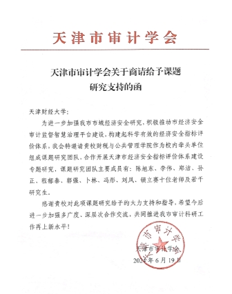 2024年6月,受天津市审计局的委托,财税与公共管理学院牵头组织,联合我校统计学院、金融学院、商学院等十余位科研骨干教师,组建专家研究团队,开展有关经济安全风险预警指标体系的专题研究,积极推动建设审计监督智慧治理平台,助力全市经济安全审计监督治理中心的组建设立。此后,与天津市审计局、审计学会、审计科研所等部门召开多次线上线下课题研讨会,分别从财政安全、金融安全、外贸安全、产业安全等十个维度开展经济安全预警的深入研究,目前已经取得阶段性成果。