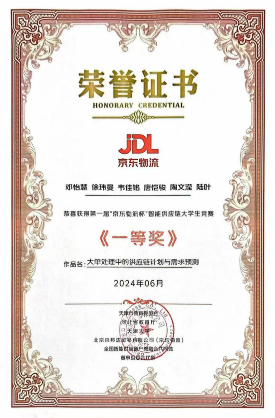 “京东物流杯”智能供应链大学生竞赛由天津大学主办、京东物流提供技术支持,天津市教育委员会、北京市教育委员会、河北省教育厅等单位共同指导。赛事历时两个月,全国共计30个省、自治区、直辖市70所院校150余支代表队报名参赛。经过初赛网络评审,最终有75支队伍入围全国总决赛。其中,在纪方老师的指导下,我校商学院物流与供应链管理系学生邓怡慧、徐玮曼、韦佳铭、唐恺骏、陶文滢、陆叶组成的“数据别和我们作队”团队的作品《大单处理中的供应链计划与需求预测》在激烈竞争中脱颖而出,荣获全国一等奖!
