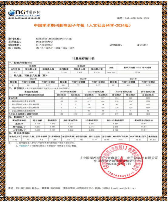 近日,《中国学术期刊(光盘版)》电子杂志社有限公司和中国科学文献计量评价研究中心联合发布《中国学术期刊影响因子年报(人文社会科学·2024版)》。数据显示,《现代财经—天津财经大学学报》学术影响力再创新高,复合影响因子从2023年的5.89上升到7.57,增幅28.9%,期刊综合影响因子从2023年的2.58成长为4.45,增幅72.5%。学科影响因子从2022年的学科排名第19位上升到第10位。