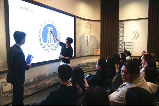“‘信’字的甲骨文原来这么有趣,一个人说到做到,就叫言而有信……”。留学生们了解到“学思达信”的校训和“天财精神”的内涵与讲解员展开了积极的交流与讨论。