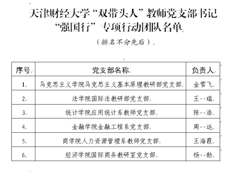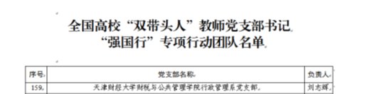 日前,教育部办公厅公布了全国高校“双带头人”教师党支部书记“强国行”专项行动团队名单,我校财税与公共管理学院行政管理系党支部成功入选。此外,我校会计学院会计学系党支部、统计学院经济统计系教师党支部、人文学院新闻与文化传播系教师党支部入选天津市“双带头人”教师党支部书记“强国行”专项行动团队。