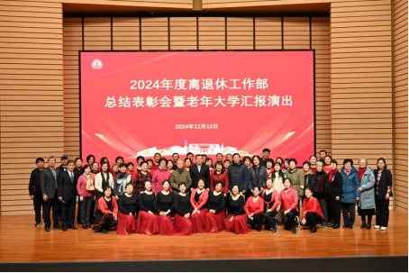 为深入学习贯彻习近平新时代中国特色社会主义思想,加强离退休教职工思想阵地、活动阵地、学习阵地建设,充分发挥老同志独特优势,离退休工作部于12月12日在月牙报告厅举行2024年度离退休工作总结表彰会暨老年大学汇报演出。校党委书记赵鸣出席活动并讲话,老领导王玉英、张嘉兴、朱利来、丁卫、王爱俭出席活动。离退休工作部相关领导及百余名老同志骨干代表参加总结表彰会。