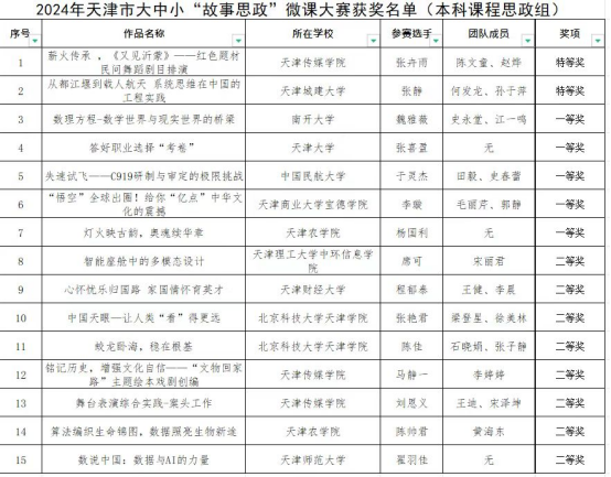 “故事思政”微课大赛自2021年举办以来,学校党委高度重视、精心谋划、认真落实,坚持把组织参加天津市大中小学“故事思政”微课大赛作为加强教师队伍建设、提高课堂教学水平的重要抓手,坚持以赛促教、以赛促研,发掘和培育了一批优秀的课程思政示范课程、课程思政教学名师,形成并推广了一批课程思政优秀教学案例。学校将以微课大赛为契机,积极探索思政课程和课程思政改革创新方式方法,引导广大教师将伟人风范、先烈事迹、新时代各行各业发展故事等转化为生动思政育人素材,突出故事运用对提升学生学习兴趣、引领价值观塑造的重要作用,不断提升思政课程和课程思政教育实效,用“小故事”讲好“大道理”,实现思想政治教育与专业教育的有机统一,努力培养担当民族复兴重任的时代新人。