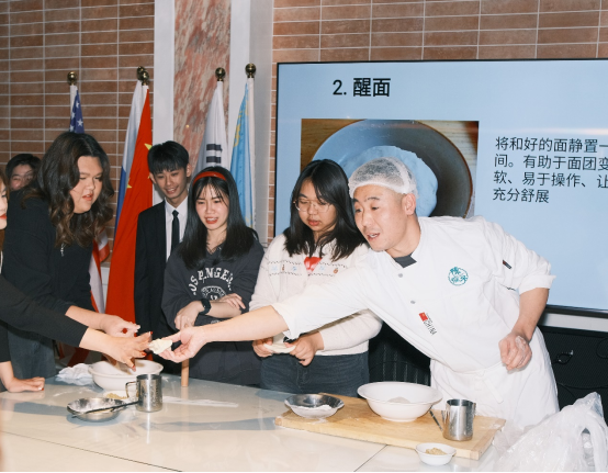 面点师傅为留学生现场示范并详细讲解中华美食知识。