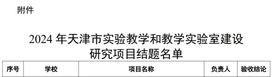 近日,市教委公布了《2024年天津市实验教学和教学实验室建设研究项目结题结果的通知》。我校3个实验教学和教学实验室建设研究项目顺利通过结题验收。实验教学和教学实验室建设研究项目是教育部、市教委深入贯彻落实习近平新时代中国特色社会主义思想和党的二十大精神,全面提高拔尖创新人才自主培养质量,不断增强实验教学育人能力,持续提升实验室建设和管理水平,专门设立相关项目开展立项研究工作,以不断增强实验教学育人能力,持续提升实验室建设和管理水平为目标的教学研究项目。