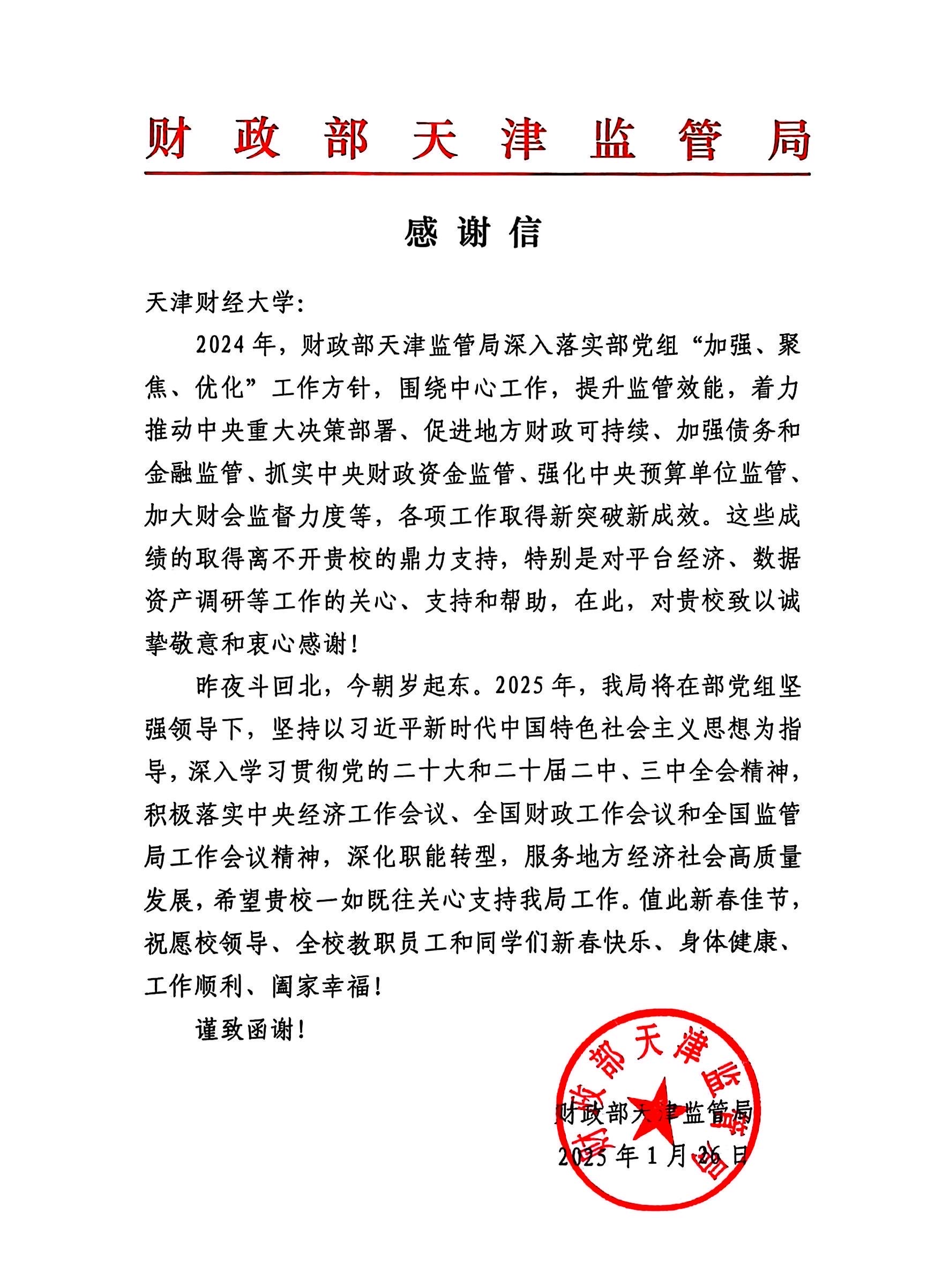 近日,财政部天津监管局向我校发来感谢信,对我校给予的支持帮助表示感谢,特别对与我校财税与公共管理学院研究团队联合开展平台经济、数据资产调研工作表示肯定。为应对数字经济时代平台经济的税收治理挑战,2024年,我校财税与公共管理学院研究团队在全面收集和分析大量数据、文献资料及一线实践案例的基础上,为财政部天津监管局在新业态税收治理的专项政策研究提供了具有参考价值和指导意义的调研成果。