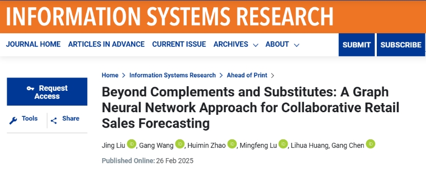 近日,我校管理科学与工程学院刘婧副教授在国际顶级期刊Information Systems Research(UTD 24)上以第一作者身份在线发表学术论文“Beyond Complements and Substitutes: A Graph Neural Network Approach for Collaborative Retail Sales Forecasting”。