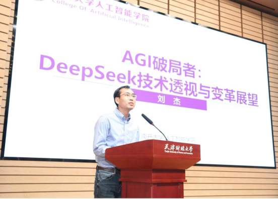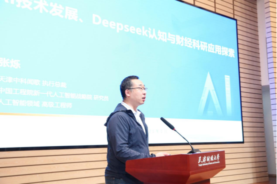 特邀嘉宾,在人工智能领域具有较深造诣和实务经验的专家为师生带来精彩讲座。南开大学刘杰教授作《AGI破局者:DeepSeek技术透视与变革展望》报告,他剖析了DeepSeek模型的发展脉络,展示了DeepSeek在教育与学术赋能、企业场景落地、专业场景提效等方面带来的人机协作变革。天津中科闻歌科技有限公司张烁执行总裁作《AI技术发展、DeepSeek认知与财经科研应用探索》报告,他从人工智能技术发展、对DeepSeek的理解、DeepSeek带来的智库研究思考三个层面作了深度解析,引发了师生对DeepSeek带来的新财经研究领域深度思考。