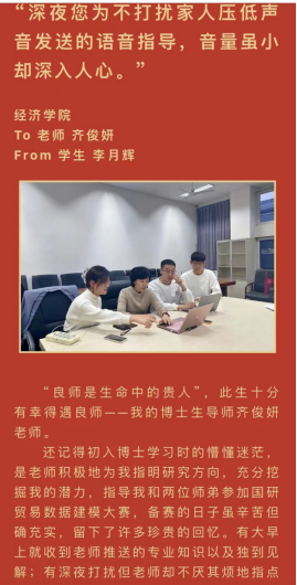 齐俊妍同志从事国际贸易与世界经济的教学和科研一线工作23年,先后入选教育部新世纪人才支持计划、天津市131创新型人才第一层次人选和天津市学科领军人才,并先后获得天津市五一劳动奖章、天津市教育系统“教工先锋岗”先进个人等荣誉称号。始终坚持学术研究、人才培养和社会服务紧密结合,充分发挥引领和外溢效应,具有强烈的学科建设意识和高度的团队培养责任感。