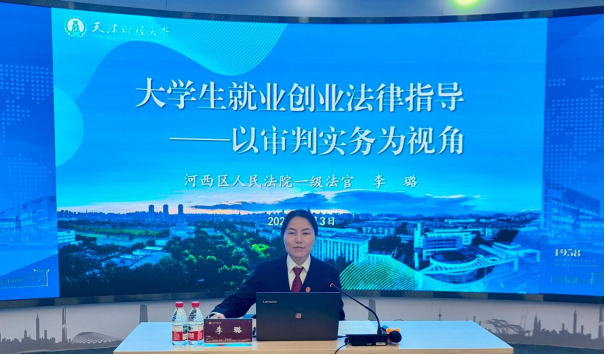 为进一步提高大学生就业创业风险防范意识和依法维权能力,帮助同学们树立爱岗敬业的从业观和诚信守法的创业观,近日,河西区人民法院潘烨、李璐、赵超三位法官及王蕾书记员走进我校,开展专题法律指导活动,李璐法官以《大学生就业创业法律指导——以审判实务为视角》为题,为近百名师生带来了一场理论与实践深度融合的法治专题讲座。