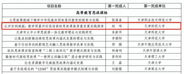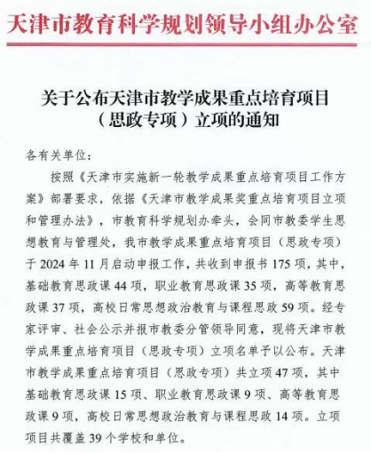 近日,天津市教育科学规划领导小组办公室发布了天津市教学成果重点培育项目(思政专项)立项通知,我校项目入围“高等教育思政课组”立项名单。