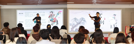 随后,中国戏曲协会会员、天津非物质文化遗产(昆曲)代表性传承人、一级演员齐林老师和天津戏曲家协会会员刘建辉老师共同为留学生们带来了一场精彩的体验式京剧文化讲座。两位老师自幼考入天津戏曲学校学习京剧表演专业,有着深厚的京剧艺术表演功底。讲座中,老师们详细介绍了京剧的发展历史、艺术特点、表演形式、文化内涵、美学特征以及当代价值与传承,并通过视频和图片展示了京剧的经典剧目和角色。