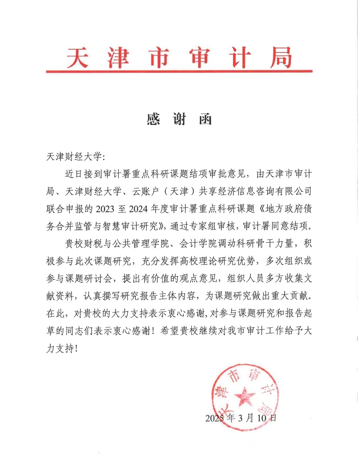 3月20日,校党委副书记、校长孟昊带队赴天津市审计局座谈交流,并出席由天津市审计局、云账户(天津)共享经济信息咨询有限公司、天津财经大学联合申报的审计署重点科研课题《地方政府债务合并监管与智慧审计研究》结项总结会,我校财税与公共管理学院、会计学院课题组成员代表陪同参加。市审计局和云账户公司主要负责同志出席会议。