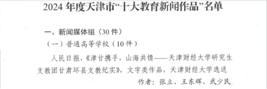 近日,市教育两委公布了2024年度天津市“十大教育新闻作品”评选结果。由我校报送的《津甘携手,山海共情——天津财经大学研究生支教团甘肃环县支教纪实》入选新闻媒体组“十大教育新闻作品”,我校在中华人民共和国成立75周年之际举办的大思政课暨主题宣讲活动《75载盛世华章 | 礼赞祖国华诞,天财这节大思政课"燃"了!!》入选单位创作组“十大教育新闻作品”。