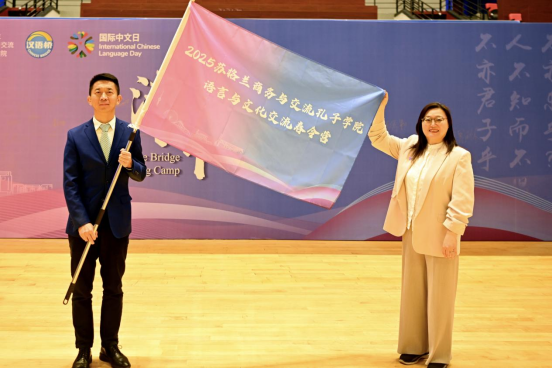 授旗环节备受瞩目,营旗招展,传递着文化交流的使命,副校长李新涛将营旗庄重授予外方领队,寓意着责任与期望的交接,承载着中外学子对文化互鉴的憧憬与共鸣。