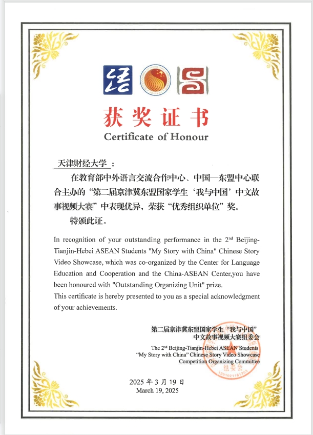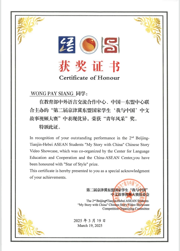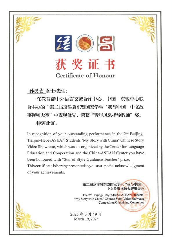 近日,第二届京津冀东盟国家学生“我与中国”中文故事视频总展演活动在天津师范大学举办。本次活动主题为:语合越山海 心桥向未来。我校师生代表受邀参加活动,来自马来西亚的国际教育学院大三本科生黄培祥获得“青年风采”奖,管理干部孙灵芝获得“青年风采指导教师”奖,我校荣获“优秀组织单位”奖。
