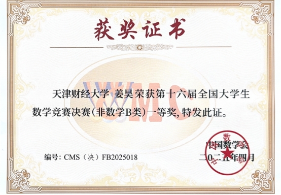 全国大学生数学竞赛始于2009年,是由中国数学会主办,面向本科学生的全国性高水平学科竞赛,旨在促进我国高等学校提高人才培养质量,促进数学课程建设与教学改革,激励学生学习数学的兴趣,发现和选拔数学创新人才,为青年学子提供展示数学能力的舞台。本届比赛来自32个赛区的1223所高校逾32万名参赛学生经层层选拔,最终产生352所高校的1254名学生跻身决赛,规模为历届之最。姜昊同学能在汇聚全国高校数学精英盛宴的总决赛中斩获一等奖桂冠令人振奋,这一成绩是我校新财经人才培养改革系列举措良好成效的充分体现。