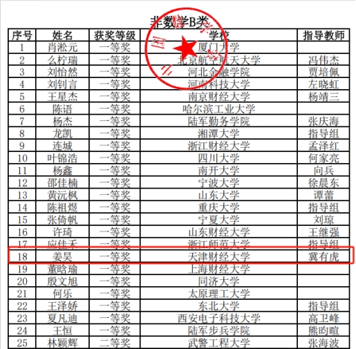 由中国数学会主办的第十六届全国大学生数学竞赛,4月11日至13日在浙江师范大学举行决赛。我校管理科学与工程学院金数2101班姜昊同学代表天津赛区(共25名)参加决赛,最终以89.50分的优异成绩勇夺全国一等奖(非数学B类),实现我校全国大学生数学竞赛国家级奖项新纪录。