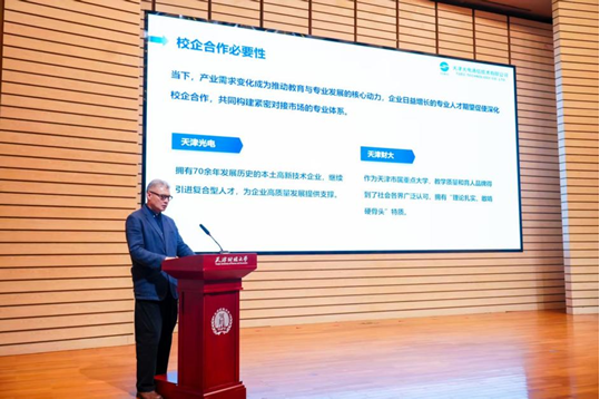 在“协同・赋能・共生——嘉宾共话‘政校企合作产学研融合’”论坛环节,天津光电通信技术有限公司党委书记、董事长孙卫东作了题为“校企结合 深度融合 共谋发展”的报告,陈海永院长分享了“面向‘人工智能 +’的人才培养创新与实践”。