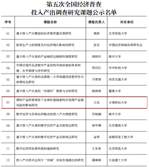 近日,第五次全国经济普查投入产出调查研究课题立项结果公布。我校数字经济与管理学院王岚教授申请的重大项目“国际产业转移视角下全球价值链重构对我国产业链风险的影响研究”成功获批,成为全国获批立项的15个项目之一。
