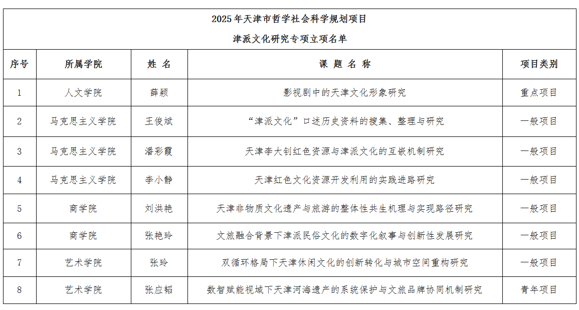 近日,天津市哲学社会科学工作办公室公布2025年天津市哲学社会科学规划项目津派文化研究专项立项名单,我校共获批8项,其中重点项目1项、一般项目6项、青年项目1项,立项率达25%。