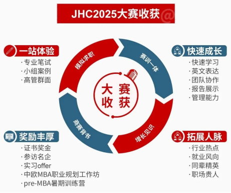 JHC大赛已举办22届。今年挑战与机遇再升一级,不仅能接触全球顶尖商学院案例,还有机会走进名企、大所和亚洲第一商学院,对话职场精英、开拓商业视野、收获职业指导和优质实习Offer。