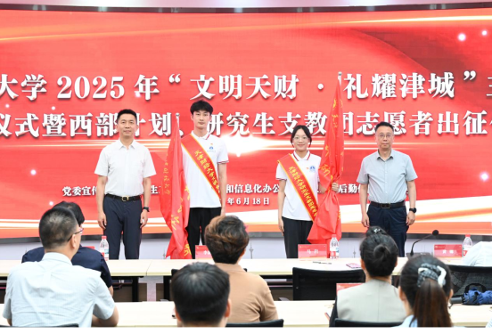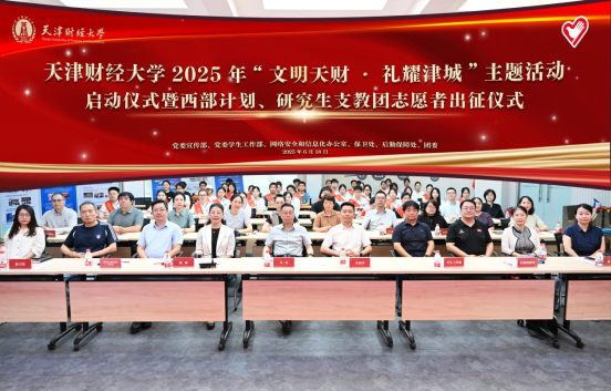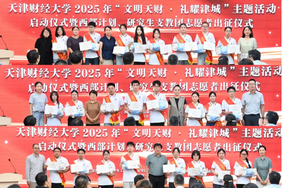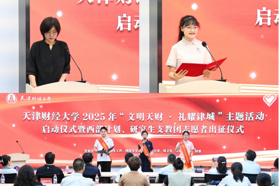 为喜迎上海合作组织峰会在我市举办,按照市教育两委《关于深入开展2025年“百万师生文明接力 争做文明有礼天津人”主题活动的通知》要求,6月18日下午,我校举办“文明天财·礼耀津城”主题活动启动仪式暨西部计划、研究生支教团志愿者出征仪式。校党委副书记马岩,党委常委、副校长李新涛出席活动。党委常委、宣传部部长黄娜主持。党委宣传部、党委学生工作部、网络安全和信息化办公室、保卫处、后勤保障处、团委等活动举办部门主要负责同志,各学院分管学生工作的党委副书记,校文明宣讲志愿服务队师生文明宣讲员代表、西部计划和研究生支教团全体志愿者参加活动。