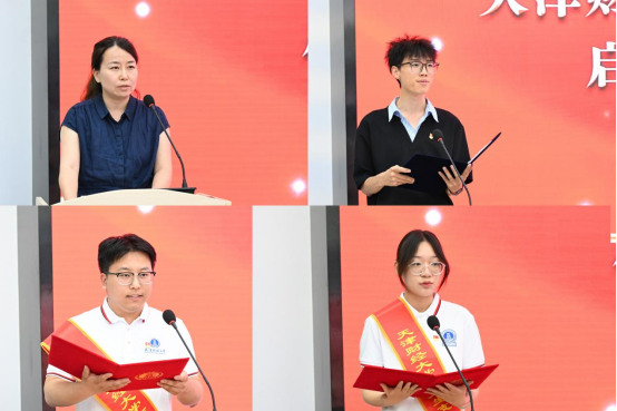 马岩、李新涛分别为研究生支教团、文明宣讲志愿服务队授旗,统计学院傅郁雯同学、商学院研究生李瑞江同学分别作为代表接旗。