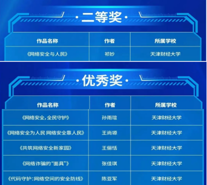 其中理工学院《网络安全与人民》荣获二等奖,经济学院《网络安全,全民守护》、国际工商学院《网络安全为人民 网络安全靠人民》、《共筑网络安全新家园》、会计学院《网络诈骗的“面具”》、管理科学与工程学院《代码守护:网络空间的安全防线》荣获优秀奖。