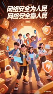 国际工商学院《网络安全为人民 网络安全靠人民》,作品以充满科技感的网络空间为背景,展现师生群体手持电子设备,搭配锁、盾牌等网络安全符号,既呼应网络安全、反诈等知识普及,又融入潮流元素,从校园生活小视角,传递网络安全靠大家、守护网络文明的大主题,用生动视觉语言推广网络安全理念 。