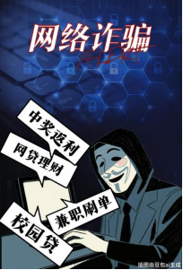 会计学院《网络诈骗的“面具”》,海报以一个戴面具的人物操作电脑为主体,象征网络诈骗背后隐藏的黑手。背景的锁和二进制代码暗示网络的复杂性和隐私安全。列出的“中奖返利”等常见诈骗手段,提醒人们提高警惕,防范网络诈骗。