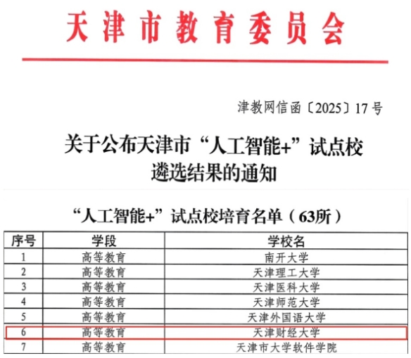 近日,天津市教育委员会发布《关于公布天津市“人工智能+”试点校遴选结果的通知》,凭借在“人工智能+教育”领域的基础和优势,我校成功入选天津市“人工智能+”试点校培育名单,成为全市七所入围的高等教育院校之一。这标志着我校在通过科技创新引领和人工智能技术部署落地,提升学校管理效能和师生服务体验方面迈出了重要一步。