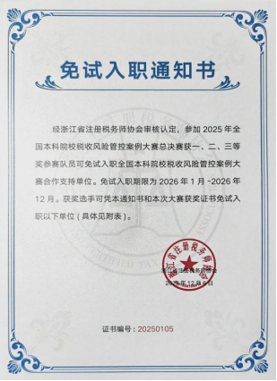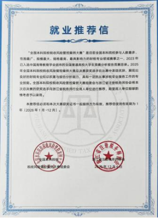 本次参赛的9名同学均获得由浙江省注册税务师协会审核认定的免试入职通知书及专属就业推荐信,为未来职业发展奠定了坚实基础,成为“以赛促就”的生动实践。