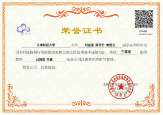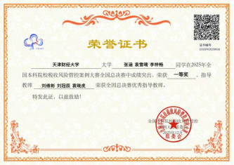 全国总决赛的舞台上,竞争更加白热化。由我校财税与公共管理学院刘维彬老师和会计学院刘冠辰老师指导的财税与公共管理学院税收专业张涵、袁雪晴同学与会计学院财务管理专业李梓畅同学团队,沉着冷静、从容应答。以前沿的风险管控思路、详实的数据支撑、严谨的逻辑推演和流畅的现场表达,深度解析涉税场景中的核心风险点,提出兼具创新性与实操性的风险防控方案,其专业素养与实战能力赢得了评委团的高度认可,最终斩获全国总决赛一等奖!