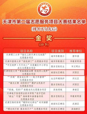 本届大赛共设置金奖10项、银奖30项、铜奖60项,100个入围项目聚焦服务百姓民生、建设美丽社区、保障安全稳定、保护生态环境、引导交通秩序、展示城市形象等关键领域,全面展现了天津市志愿服务的专业水准与创新活力。