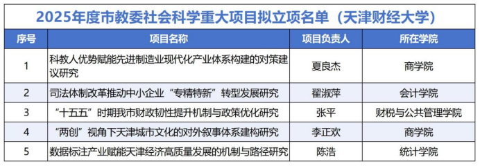 此次拟立项的5个项目,主要围绕经济现代化、产业创新、法治改革、文化传播与财政韧性等方向展开,涉及天津“制造业立市”“专精特新”发展、财政能力提升、城市文化国际传播、数字经济赋能等领域。项目内容结合天津市发展实际,注重问题分析与对策研究,展现出我校在服务地方经济社会发展方面的持续努力。