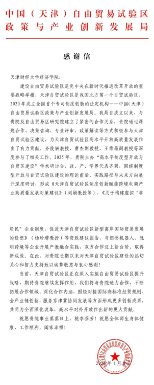 近日,中国(天津)自由贸易试验区政策与产业创新发展局向我校发来感谢信,感谢学校经济学院以及自贸区研究院长期以来通过课题合作、决策咨询、专业评审、政策解读等方式积极参与天津自贸试验区建设,为天津自贸试验区高水平开放高质量发展做出的有力贡献,并期待与经济学院进一步深化合作,为深入实施自贸区提升战略、服务京津冀协同发展等方面形成更多创新成果,共同为全面深化改革、高水平对外开放做出新的更大贡献。