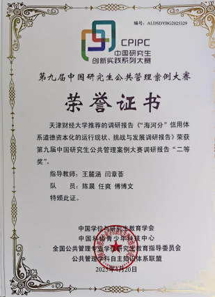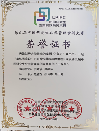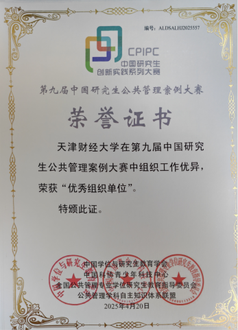 2025年4月,第九届中国研究生公共管理案例大赛圆满落幕,我校财税与公共管理学院研究生荣获案例三等奖(前100强)1项,案例优秀奖(前 20%)3项;调研报告赛道中斩获二等奖1项,三等奖4项。学校再次获评“优秀组织单位奖”,这是我校连续第四次获此殊荣。
