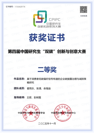 2025年11月,“沈化百特杯”第四届中国研究生“双碳”创新与创意大赛传来捷报,我校管理科学与工程学院研究生获得二等奖1项,这是我校学子首次在该项赛事获奖。该项赛事以“创意启迪智慧、创新驱动发展”为理念,围绕“智慧双碳,创享未来”主题,旨在增强研究生对“双碳”战略理念的认识,展现服务国家重大战略的责任担当。