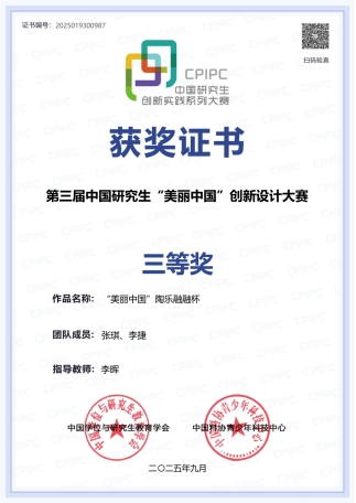 2025年9月,第三届中国研究生“美丽中国”创新设计大赛圆满结束,我校艺术学院研究生获得三等奖1项,这是我校研究生首次获奖。该项赛事旨在全面呈现、传播“美丽中国”新时代风貌,激发研究生创新设计意识与设计实践能力,向世界积极展示和传播中国文化,讲好中国故事。