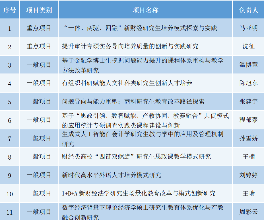 天津市研究生教改项目是市教委深入贯彻党的二十大精神、全面落实习近平总书记关于研究生教育的重要指示精神,聚焦深化研究生教育教学改革、破解发展重大理论与实践难题、培育高水平教学成果、推动区域研究生教育高质量发展的重要举措,为学校人才培养改革提供了重要抓手。长期以来,我校始终将研究生教育教学研究与改革置于战略高度,紧扣“新财经”建设核心目标,主动对接新时代研究生教育发展需求,打破学科壁垒,探索跨领域、重实效的育人新路径。此次11项立项的取得,是在2023年10项立项基础上的持续突破,为学校后续教学成果凝练、育人模式创新积蓄了坚实力量。