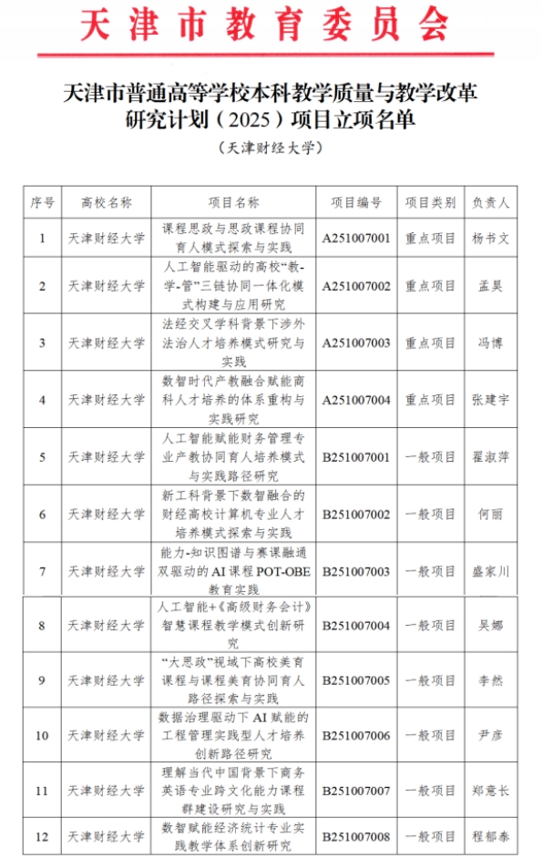 近日,天津市教委正式发布《市教委关于公布天津市普通高等学校本科教学质量与教学改革研究计划项目(2025)立项结果的通知》(津教高函〔2026〕4号),我校共有12个项目获批立项,其中重点项目4项、一般项目8项,充分展现了我校在本科教学改革与质量提升方面的扎实基础与持续推动力。