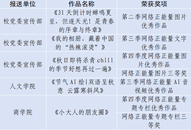 本次活动自2025年3月启动以来,得到各部门、各基层党委的大力支持。我校积极参与,围绕网络正能量文字、网络正能量图片、网络正能量专题专栏、网络正能量主题活动、网络正能量音视频等内容创作优秀作品,作品主题鲜明、形式多样、内容鲜活,充分展现了天财师生昂扬向上的精神风貌。